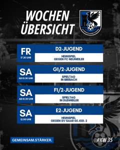 🏆 FR., 29.08.:⏰ 17:30 Uhr | D2-JUGEND (Heim)JSG Bübingen-Kleinblittersdorf – FC Neuweiler 🏆 SA., 30.08.:⏰ ab 10:30 Uhr | G1/2-JUGEND (Auswärts)Spieltag in Brebach⏰ ab 10:30 Uhr | F1/2-JUGEND (Auswärts)Spieltag in Dudweiler⏰ 12:00 Uhr | E2-JUGEND (Heim)JSG Bübingen-Kleinblittersdorf – SV Saar 05 Jgd. 2⏰ ab 13:00 Uhr | F3/4-JUGEND (Auswärts)Spieltag in
