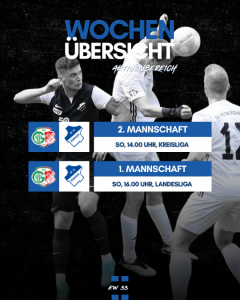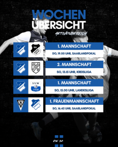 HERREN 1 (LANDESLIGA):Mi., 30.07. | 19:00 Uhr (Auswärts)DJK Püttlingen – SV 19 Bübingen HERREN 2 (KREISLIGA):Do., 31.07. | 19:00 Uhr (Auswärts)FV Bischmisheim 2 – SV 19 Bübingen 2 SONNTAG, 03.08.: 13:00 Uhr (H2 Auswärts):SV Rockershausen 2 – SV 19 Bübingen 2 15:00 Uhr (H1 Auswärts):SV Rockershausen – SV 19 Bübingen